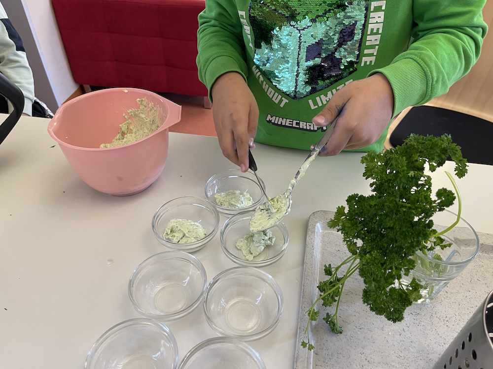 Wir haben ganz viel geübt und auch neues gelernt: Gemüse schneiden, Kräuter hacken, abschmecken, würzen, dekorieren… Und das Beste zum Schluss: Wir durften natürlich alles selbst probieren. Es war richtig lecker!