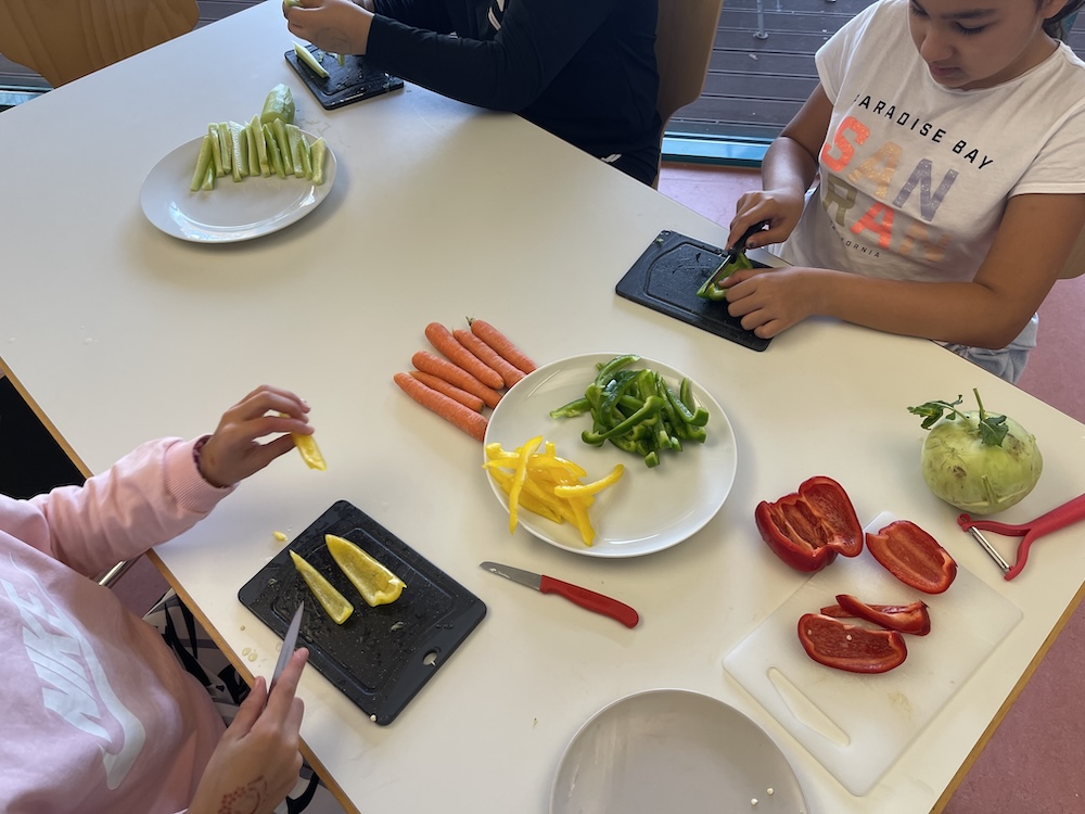 Wir haben verschiedene Gemüsesorten ausgewählt und kleingeschnitten. Am Ende hatten wir zwei Teller voll mit buntem, frisch geschnittenem Gemüse – total lecker und gesund!